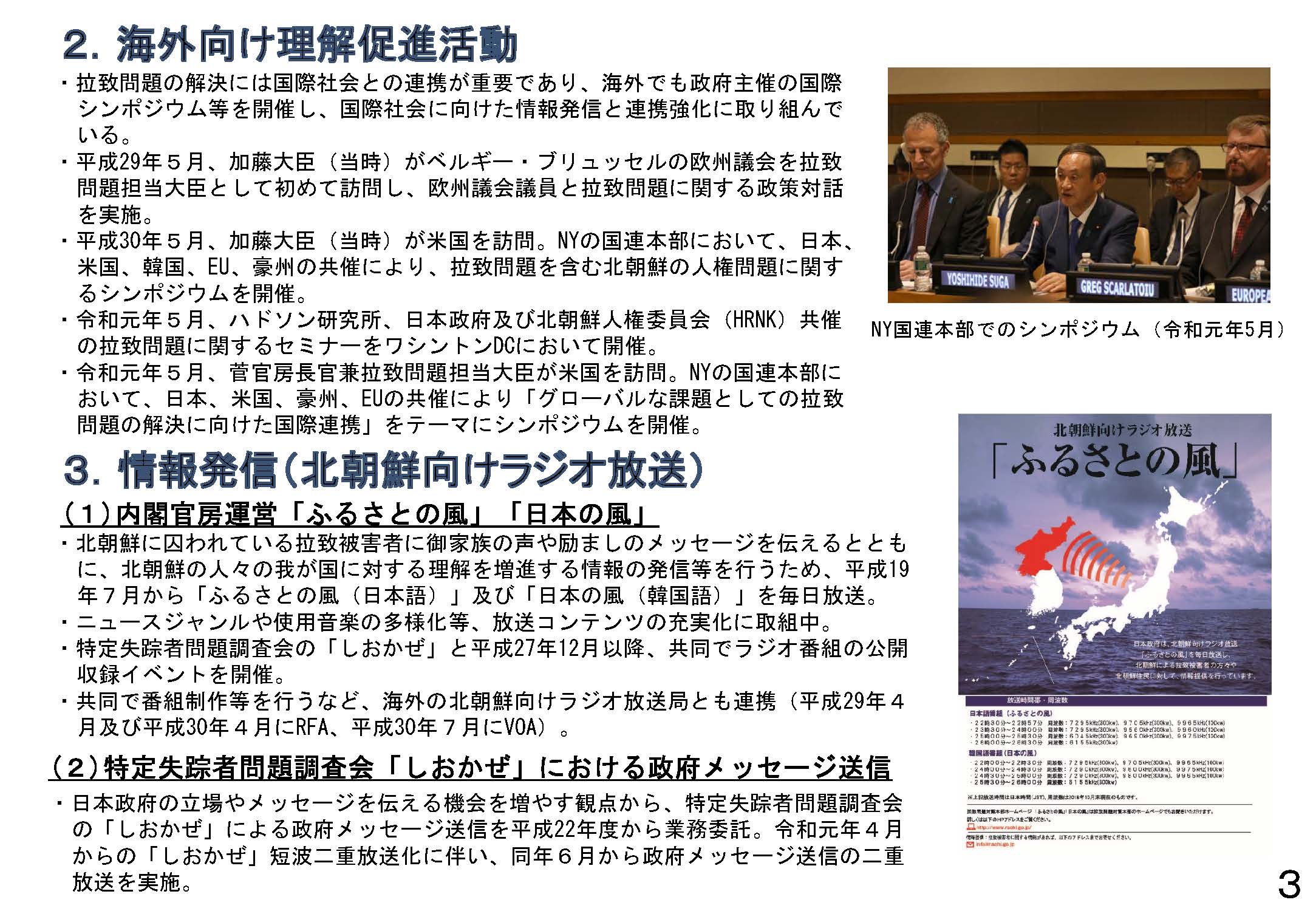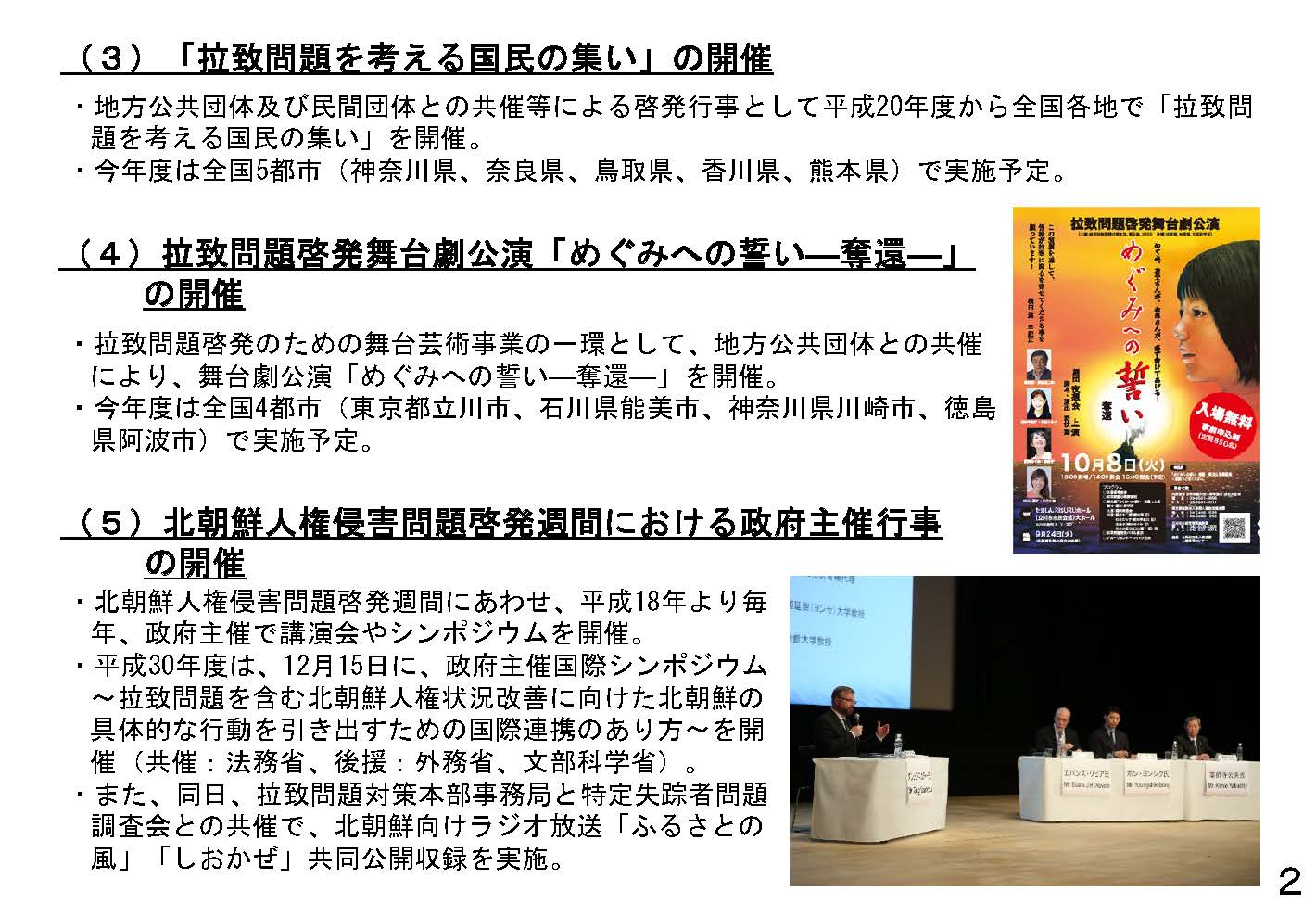 加藤拉致問題担当大臣は、地方公共団体における拉致問題に関する啓発イベントの積極開催及び当該イベント等について自治体広報誌において取り上げて貰えるよう、各都道府県等に対し通知を発出し、協力を要請しました。