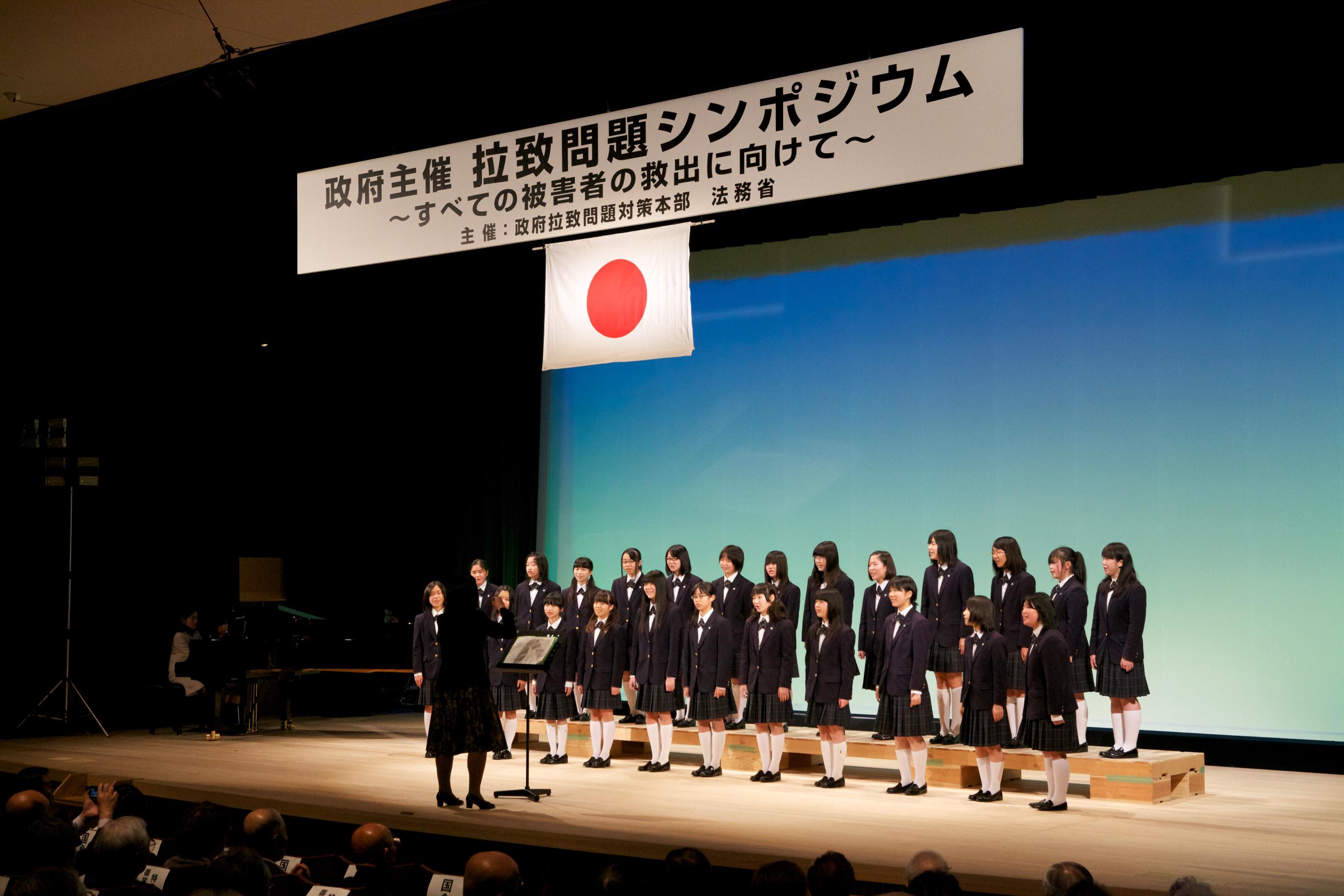 その後、昨年度東京都合唱コンク―ルで金賞を受賞した昭島市立清泉中学校コーラス部の皆さんによって、「葡萄の歌」と「風に寄せて」の2曲が合唱されました。最後に、「拉致被害者御家族からの訴え」と題して、当日出席いただいた拉致被害者御家族から一日も早い拉致問題の解決への切実な思いを語っていただき、三谷拉致問題対策本部事務局長代理から、「拉致被害者御家族のお言葉を真摯に受け止め、拉致問題解決に向けて全力を尽くしたい。」と述べたうえで、国民の皆様に対する一層の御協力をお願いしました。