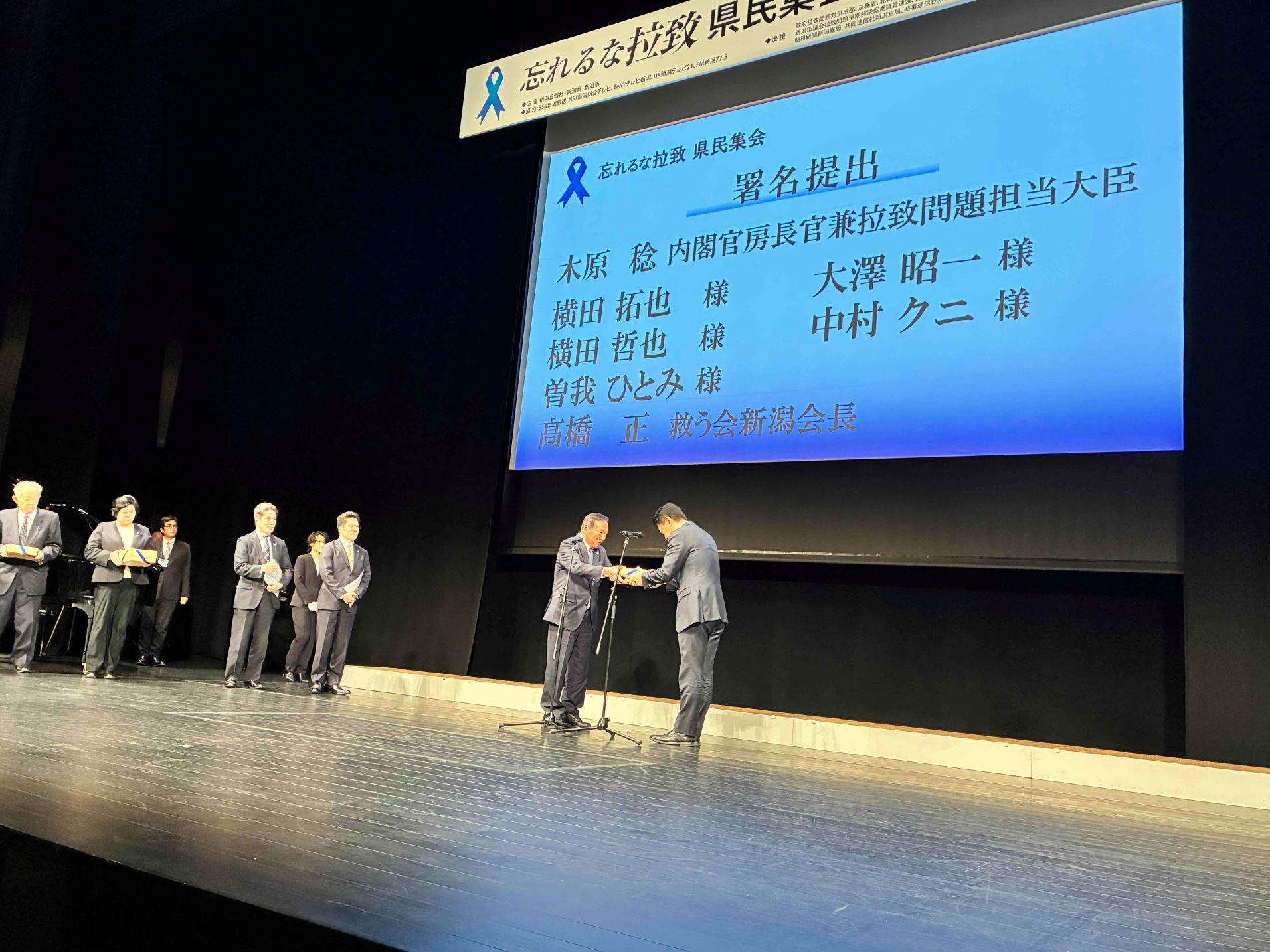 (木原官房長官兼拉致問題担当大臣への署名簿提出)
