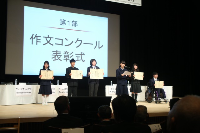 제1부에서는, 북조선 인권 침해 문제 계몽 주간 • 작문 콩쿠르표창식이 열려, 스가 납치문제담당대신이 수상자에게 표창장을 수여한 것을 비롯해 최우수상 수상자가 작문을 낭독했습니다.